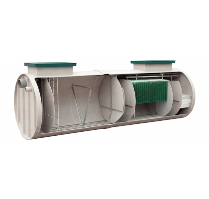 Каждый из двух прочных герметичных корпусов выполнен из первичного полипропилена, обладающего высокой стойкостью к коррозии, механическим и химическим воздействиям. Конструкция очистных сооружений оптимизирована для монтажа в тяжёлых и пучинистых грунтах без необходимости использования дополнительного якорения и позволяет сохранять полезное пространство на участке благодаря подземному размещению.